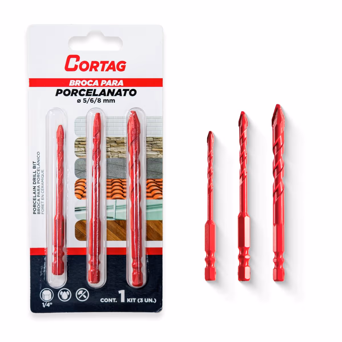 ¡Y eso no es todo! Echa un vistazo también a la línea de brocas para porcelánico Cortag. Es la solución más eficaz del mercado, ya que ofrece una perforación precisa, limpia y con un acabado profesional. Su punta de alta dureza evita astillas y desviaciones, mientras que su diseño permite un enfriamiento adecuado del material y ofrece estabilidad desde el inicio del taladro.